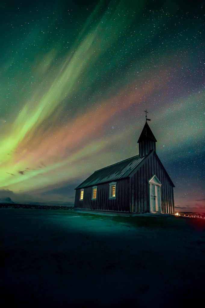 I had already taken my photos of the church and was back in the car. When I looked at the photos on the screen there, I noticed that they were minimally out of focus. So I went out again and took new photos, the auroras became stronger again in that moment and I took this photo.